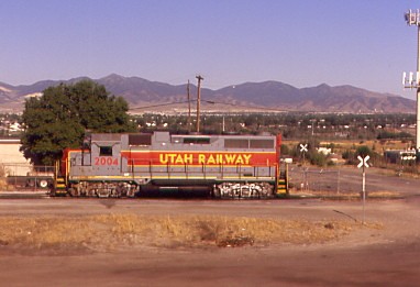 At Midvale, we passed the Utah Railroad shop area with Utah Railway GP38-3 2004, ex. Utah Railway GP38 2004, exx. Southern Pacific GP35R 6320, exx. Southern Pacific GP35 6618, nee Southern Pacific 7721 built by Electro-Motive Division in 1965, then Utah Transit Authority's light rail shops. That was followed by the Jordan River below Point of the Mountain into the Provo Valley where we stopped in Provo but of course, no one boarded because our train was not supposed to be here today.
