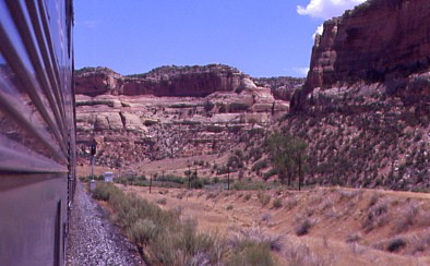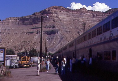 The California Zephyr continued east across the Grand Valley and through De Beque Canyon then at Lacy, we met our westbound counterpart in the siding running slightly tardy at 45 minutes. We ran through Rifle then made our way to Glenwood Springs, departing there at 4:38 PM {12:57 PM} before travelling into a darkened Glenwood Canyon beneath some clouds that produced a little rain. At Dotsero, we had a red signal that finally changed to red over green with our train travelling north for Red Rock Canyon. We came to Bond and Carl and I went in for our 6:00 PM dinner reservation, eating with Al from Akron, Ohio and Mary from Des Moines, Iowa. I ordered the "Evening Special", beef tips, which were excellent and had a sundae. While this incredible meal was occuring, we did not move an inch and there were no announcements in the dining car about our delay.