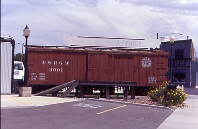 I spotted Denver and Rio Grande Western narrow gauge box car 3001 built by American Car and Foundry in 1904 across the street from the former Rio Grande station. We departed at 2:47 PM {11:05 AM}.