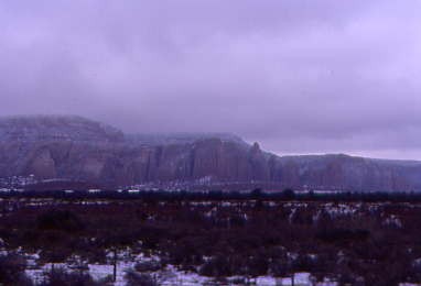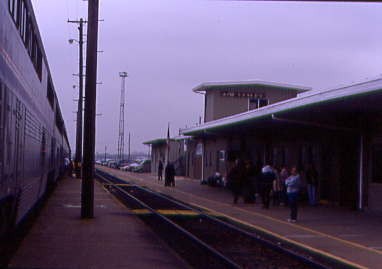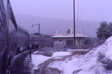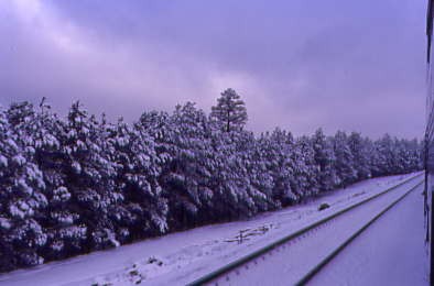3/25/2005 I awoke to the snowy landscape of the Arizona Divide and enjoyed breakfast with Mario, on his way home to Washington, DC on the Capitol Limited. When he found out that I was going on the Cardinal and through the New River Gorge, he wished that he would have booked his trip that way. The French Toast and sausage really hit the spot before we arrived at Flagstaff, where my former Pacific Surfliner conductor John Kennedy saw me and said he would stop by later for a visit. Leaving Flagstaff an hour late, I put on Jeff Beck's "Who Else" and sat back to enjoy the ever-changing views on an extremely overcast morning as the train sped east. Aerosmith's "Just Push Play" just started as about 14 miles west of Winslow, the train crawled along, coming to an extended stop about six miles from town due to freight train interference.