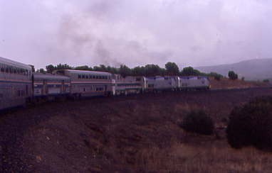 BNSF 8066 added ExpressTrak mechanical refrigerator car 74030 to the rear of the Southwest Chief then they cut the ExpressTrak cars from the rear to remove 74064. Meanwhile, our power cut off to retrieve sleeping car 39037 which they picked up off the other mainline, then tucked it in front of the baggage car. Next our three engines were refuelled and we finally departed Albuquerque at 2:35 PM {1:10 PM} as I listened to Ozzy Osbourne's "Down to Earth". I enjoyed watching the stormy skies as we made our way north towards Lamy. At Nueva, we held the mainline to wait for the westbound Southwest Chief Train 3 with no ExpressTrak cars on the rear. I switched to Yes' "Key of Ascension", the new tracks from both CD sets. While our crew relined the switch, a good thunderstorm, complete with small hail, occurred. We departed Lamy at 4:00 PM {2:16 PM} then climbed through Apache Canyon and onto Glorieta Pass, where it was snowing.
