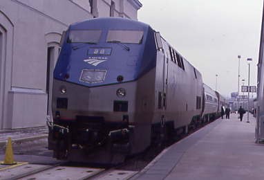 Southwest Chief 4 3/24/2005As I walked up to Track 12, the Southwest Chief was reversing in and the train to Chicago had P42DCs 153, 46 and 505, baggage 1213, transition 39007, sleepers 32074 "Colorado" and 32034, diner 38050, lounge 33011 with coaches 34001, 31502 and 31041. I was greeted at the door of sleeper 32034 by my attendant Cassandra, who directed me to Room 5. After setting up my room, it was time to listen to Rush's "Roll the Bones" and the song "Dreamline" was a perfect choice with the line "We are only at home on the run!" Ken Ruben stopped by to see me off on this rail journey then the Southwest Chief pulled forward at departure time before reversing to pick up ExpressTrak mechanical refrigerator cars 74064, 74041, 74082, 74039 and 74109 before we made our way to Fullerton.