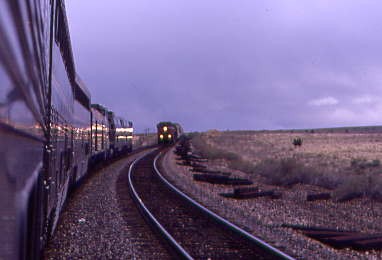 Later the Southwest Chief climbed the "S" curves at Chapelle. I had a 5:00 PM dinner reservation with Marie, along with Carrie and Jade, all going to Chicago. The dinner conversation was about Amtrak, the lack of funding, the history of Amtrak and a few stories of mine thrown in for good measure. I repeated last night's dinner with very fine success then as night took hold, listened to Jethro Tull's "Nothing is Easy", which took me all the way to a snowy Raton. We departed there at 7:20 PM {5:44 PM} after some of our sleeping car passengers had an impromptu snowball fight. The train climbed Raton Pass and entered Colorado where I called it a night.