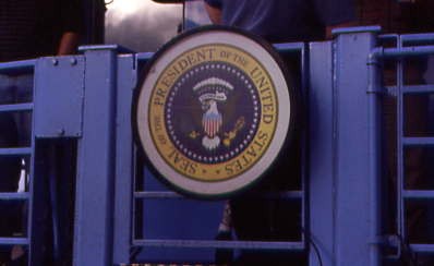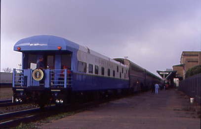The Presidential Seal of the United States in the drumhead. We departed on time and proceeded southwest into Texas. Led Zeppelin's "Early Days and Later Days" was my next musical choice as we rolled through the forests and hills until Jefferson, Texas, where we slowed while a Kansas City Southern freight cleared the crossing there. Minutes later, at Woodlawn, we took the siding to meet Norfolk Southern 8970 East and Union Pacific 9147 East then arrived at Marshall.
