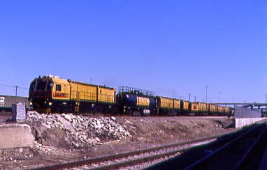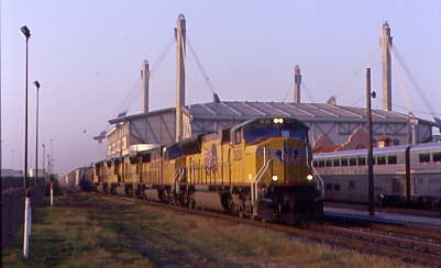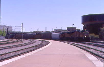 With no toilets and another Union Pacicic black hole, it was time to think "Every trip is an adventure!" We sat for fourteen minutes just short of Tornillo before continuing west, passing Union Pacific 3381 East in the siding there. We went about ten miles when I put on the second Led Zeppelin CD "the Latter Years" again to see if the train could beat the CD to its end before reaching El Paso. We stopped again with the CD playing "Kashmir" which was the fifth song on the disc. We finally overtook Union Pacific 4547 West with two songs left. The CD finished before we reached El Paso at 8:18 PM {5:10 PM} and a nice touch on the way was the Wells Fargo building decorated in fluorescent lights, making it look like an American flag.