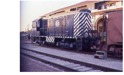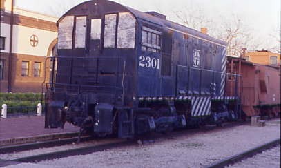 Santa Fe HH600 2301 built by American Locomotive Company in 1937. It is the oldest surviving Santa Fe diesel. The first HH series, demonstrator 6600, was built in 1931. After demonstration on a number of railroads, the unit was sold to the New York, New Haven & Hartford who numbered it 0900. After retiring in 1964, 2301 was sold to Palo Duro Grain and by 1970, it was working for Tulia Grain at Tulia, on the AT&SF line from Lubbock to Amarillo, still painted in its zebra stripe paint scheme, although all Santa Fe markings had been painted out. By 1992, 2301 had been pushed out to a side line, its duties having been taken over by an EMD switcher. It was rescued and cosmetically restored to AT&SF colours by the museum. It had originally been planned to make the unit operational, but the cost proved prohibitively high.