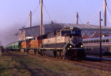We arrived at Alton well after dark and I had the light of my room out to enjoy the approach to St. Louis. Ddowntown stood out and the Arch was beautiful in the ever-changing night-time view and I could even see that horrible hotel that I stayed at during the 2001 National Railway Historical Society convention. The Texas Eagle crossed the Mississippi River into Missouri and stopped at the brand new Amtrak station in St Louis and I detrained to see the new station and what an improvement it was over the old temporary building that had been there for years. I then walked back and talked with the owner of the "Northstar", a former Great Northern sleeping car that Vice-President George W. Bush rode on October 31, 1988 between Baltimore and Washington. From the outside, it is a beautiful car which was going to San Antonio for some work. I returned to my room, made my bed up and called it a night right after we departed on time.