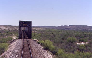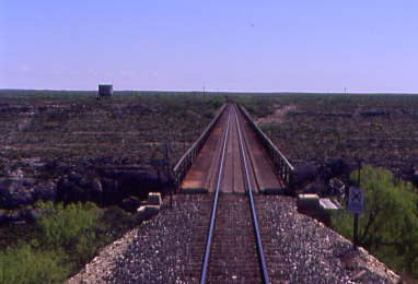 An interesting rail bridge east of Sanderson. We slowed for the flag stop at Sanderson but with no passengers, just passed through at 2:03 PM {11:10 AM} with the former Southern Pacific station still standing, although in bad shape.