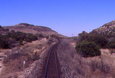 After a ten minute delay, the Sunset Limited started down San Timiteo Canyon and after passing two more eastbounds at Hinda, we crossed back to the north track where Union Pacific 9610 East worked hard climbing the grade passing us.