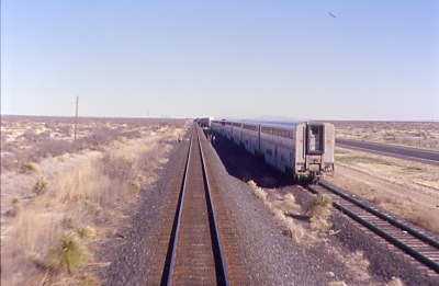 After all the side views I have taken crossing the Pecos River, how about a rear door view for a change? I walked the train and talked with our conductor in order to get the train's consist, which was P42DC 836 and P32-8 507, transition/aleeper 39017, sleeper 32093, diner 38063, lounge 33034, coaches 34137, 31005 and 34057 with my sleeper 32115 "Washington" bring up the markers. I had to have something else to do in west Texas other then listen to music or doing word fill-ins.