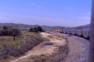 Sunset Limited 1 3/31/2005I went to the dining car with Robert Berry as my server and ordered pancakes and sausage. We departed at 7:57 AM {5:40 AM} and escaped the San Antonio area with no delays. I learned from my fellow Sunset passengers that it had been delayed by freight train congestion just west of New Orleans and east of Houston. West of Locust, we had a nice slow order.