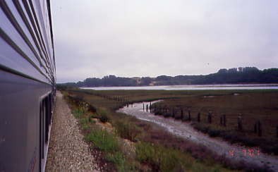 Crossing the Salinas River. At McKay, Union Pacific 5830 West was in the siding but the crew had to re-line the east switch for our continued movement. We arrived at Paso Robles and departed there at 4:23 PM {1:38 PM} then met the northbound Coast Starlight at Santa Margarita a little late after the removal of a passenger by the police at San Luis Obispo. I talked with Hak To, my wonderful Sleeping Attendant, as the train descended Cuesta Grade and we arrived at San Luis Obispo for a fresh air break then departd at 5:39 PM {3:20 PM}. I had a 5:45 PM dinner reservation and went into the parlour car to wait, being called into dinner at 6:05 PM. Tom O'Conner, celebrating thirty years of Amtrak service today, was our server and I was joined by Judy and Don from Boerne, Texas. We all had the chicken fried steak as we neared the very foggy California coast. I enjoyed a chocolate sundae for dessert then at Sudden, we met Pacific Surfliner 775 before stopping to align the east switch.
