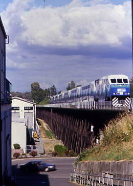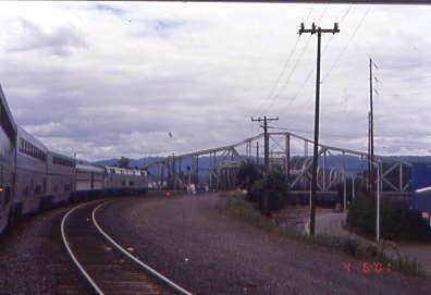 We were brought into Track 4, so to enter the station, passengers had to walk around the front of the Coast Starlight and the rear of the Empire Builder. I bought hot tamales and some postcards. Problems with the Steel Bridge, a lift span, delayed our departure, as did "Getting a splash of fuel!" We departed at 3:08 PM {2:25 PM} as I stood at the rear door watching us leave and crossing the Steel Bridge. We had no delays to Salem, where we departd at 4:20 PM {3:37 PM} on what turned out to be a beautiful sunny afternoon and the Coast Range stood to the west across the Willamette Valley. At Renard, we found a Union Pacific piggyback train, with a local in the same siding, hanging out onto the mainline which delayed our passage for five minutes. Approaching Albany, I saw Doyle McCormack's Nickel Plate RSD-5 324 and other Willamette and Pacific Railroad locomotives. We departed there at 5:05 PM {4:10 PM} and went into the siding at Alford for the northbound Coast Starlight, running three-and-a-half hours late. After that, I had a 5:00 PM dinner reservation with Richard, and at 5:15 PM, was joined by Winthrop and Gail. I had Prime Rib and a chocolate sundae off Menu 1. I wish Amtrak would not use the pre-prepared Prime Rib and returned to cooking it onboard as was done on my first Coast Starlight trip in December 1980. That was fantastic restaurant Prime Rib, not this poor version.