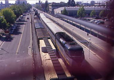 The view of the Oakland Hills from my room. After a few minutes rest, Chris and I ran some errands before going to Denny's for dinner, returning to the hotel where I watched some Russian UFOs on the History Channel then went back to the Amtrak station to find Bob Riskie, while Chris stayed at the hotel. His train was twenty-four minutes late and arrived after a late California Zephyr arrived and departed for the yard. While I waited, I passed the time talking with two local Bay Area rail photographers, who were also readers of my website. Bob and I returned to the Holiday Inn for the night.