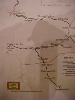 The track between Americus and Buena Vista was built by the Buena Vista & Ellaville Railroad organized in 1880 and completed in 1887. It was acquired by the Savannah & Western then controlled by the Central of Georgia Railroad in 1888 as {part of their through route linking Savannah and Columbus}. This connected with the central part of the route between Lyons and Americus which was owned by the Savannah, Americus and Montgomery Railway. West from Americus the S&W built into Columbus by first acquiring the BV&E and then built the rest of the track into Columbus. By the mid 1890's this route was a failure and in 1896 the Central of Georgia leased the line east of Lyons to the Seaboard Air Line, which became part of their Savannah-Columbus-Montgomery Line.