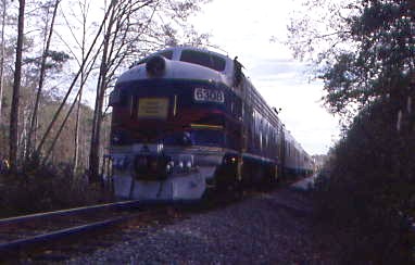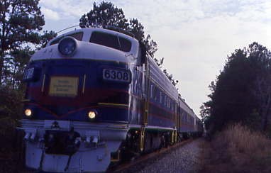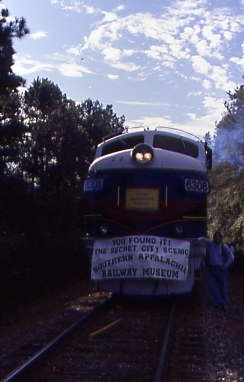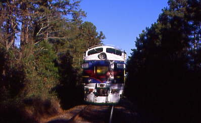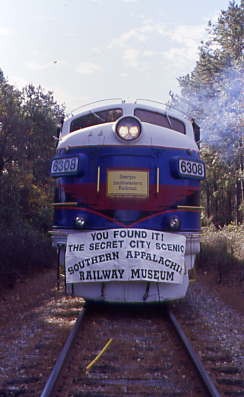 Bart Jennings put this sign on the front of our train so people would know this is the train! This is Georgia Southwestern F9A 6308, ex. VIA 6521, exx. VIA 6308, nee Canadian National 6308 built by Electro-Motive Division in 1957.