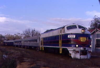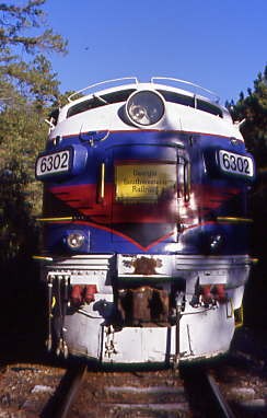 Our rear locomotive was Georgia Southwestern F9A 6302, ex. VIA 6533, exx. VIA 6302, nee Canadian National 6302 built by Electro-Motive Division in 1958.