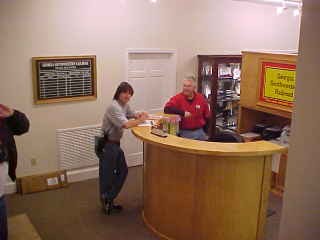 The Georgia Southwestern Offices and Museum Tour 11/20/2005On the trip yesterday, all passengers received an invitation to visit the Georgia Southwestern Railroad offices and museum at 7:00 AM. Chris and I arose early, stopped for a Subway sandwich to go before driving to the train station on a dark and cool Georgia morning. We parked, put our belongings on the train then walked to the offices up on the small hill overlooking the station.