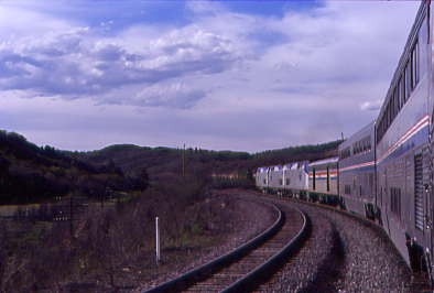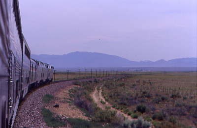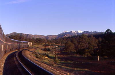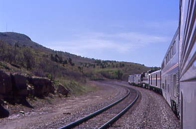 The Southwest Chief climbed Raton Pass, twisting and turning as it climbed to the state line of New Mexico before entering the Raton Tunnel. Geddy Lee's (of Rush) "My Favorite Headache" took me to Raton then we had an extended fresh air stop as we were early but departed on time as I prepared for a needed nap. After a restful and relaxing sleep, I woke up in the exact place as yesterday on the eastbound journey then went to the lounge for a chocolate chip cookie from Shirley Robinson, the fantastic Lead Service Attendant in the lounge. Sitting upstairs, I met Duncan from England on his way to Flagstaff for a driving tour to Denver. I pointed out Starvation Peak and told the story of its name. We also enjoyed the "S" curve and the crossing of the rain-swollen Pecos River, then returned to my room for the climb to Glorieta Pass.