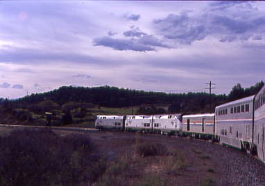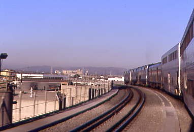 5/23/2005 Up at 4:50 AM for the 5:00 AM breakfast serving with a last call at San Bernardino, I was seated as the train was still climbing the north flank of Cajon Pass as night was still in total control. We crested Summit and started downgrade as dawn had just began to take hold. I enjoyed my French Toast and bacon, along with conversation with Richard and Elaine prior to our pre-dawn arrival at San Bernardino. Jethro Tull's "Under Wraps" was my first musical choice of the morning as we stopped at Riverside and the sun rose though a hazy sky as we started our run to Fullerton. We ran into the low clouds as we proceeded through Santa Ana Canyon. More Tull was enjoyed as I listened to "Broadsword and the Beast" then we departed Fullerton at 6:51 AM {6:34 AM} and made our final sprint to LAUPT, arriving there at 7:21 AM, fifty-four minutes early. A special thank you to all my onboard Amtrak staff and train crews for an excellent trip and making it a big success. I love early-arriving trains!
