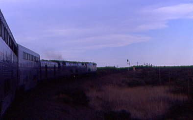 Wagon Mound on our way to Raton, after I switched to Emerson, Lake & Palmer's "In the Hot Seat", which took me to 5:00 PM and my dinner time on the Southwest Chief which was served by Douglas, a one-legged waiter who did a fantastic job. I had another New York strip, with Bruce, going to New York, who chose rack of lamb. While we were eating, the train stopped at the fresh air stop of Raton.