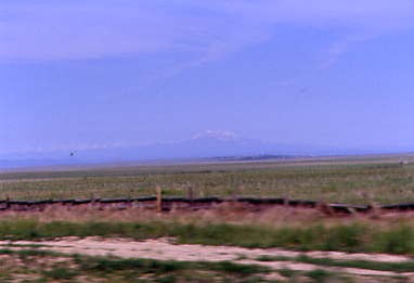 The Spanish Peaks, also known as the Mother's Breast by the American Indians, were seen on a very humid morning on our way to Trinidad. I was listening to Patrick Moraz's "The Story Of I" for the first musical choice of the morning and as we came into Trinidad, we passed an eastbound BNSF piggyback train.