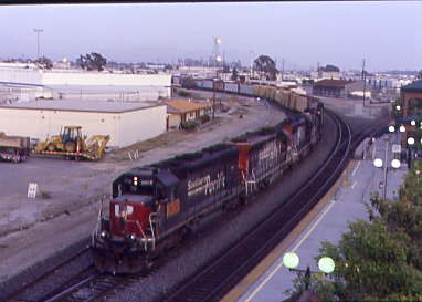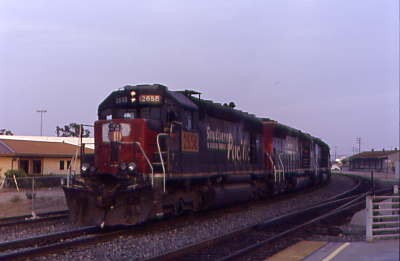 From the Oxnard station platform, the Southern Pacific locomotives pulled their consist by me, led by SD45 2658:1, nee Southern Pacific SD40M-2 built by Electro-Motive Division in 1969.