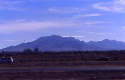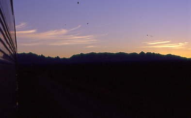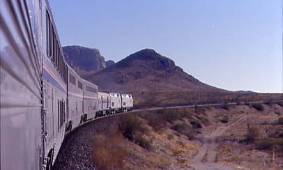 12/17/2005 We took over an hour to get into Tucson and finally departed there at 4:00 AM {2:20 AM} then it took another hour to escape from Tucson. I awoke at 6:45 AM finding us climbing the Dragoon Mountains and went to the dining car for breakfast, seated with Alan and Jennifer going to Houston, and Peggy heading to New Orleans then on to Florida. We stopped at Milepost 1041, formerly Sybil, while I enjoyed French Toast and sausage. Alan and Jennifer told us about evacuating Houston and coming home, only to find an old oak tree had been blown onto their roof.