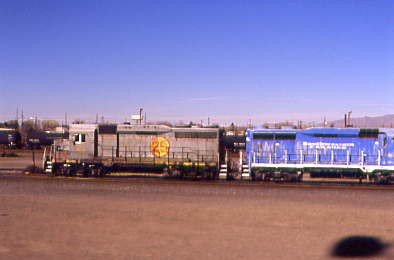 We rolled through Deming at 1:10 PM, running over seven hours late, as Southwestern Railroad GP30 29, nee Phelps Dodge 29 built by Electro-Motive Division in 1963, and Southwestern Railroad GP40 9710, ex. CSXT 9710, exx. Seaboard System 6764, nee Seaboard Coast Line 1610 built by Electro-Motive Division in 1970, looked on.