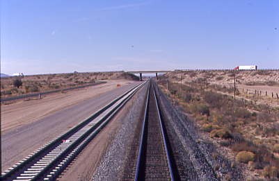 Our train finally moved again and passed this freight. On the way to Dragoon, we passed three more westbound freights and came to Milepost 1056, where we stopped at a red signal which then turned yellow, meaning we were following some train east. We ran by Apache with a westbound local there before racing across the Wilcox Playa. I finished the U2 album and switched to Rod Stewart's "Stay With Me" as we finally ran around CEFX 2789 East with a long string of piggyback flats.