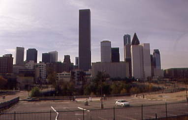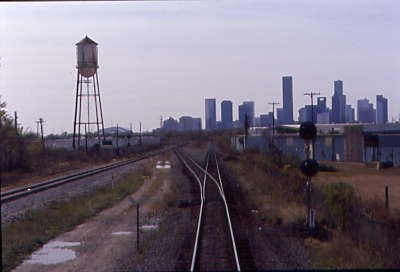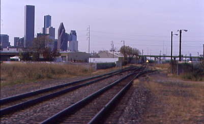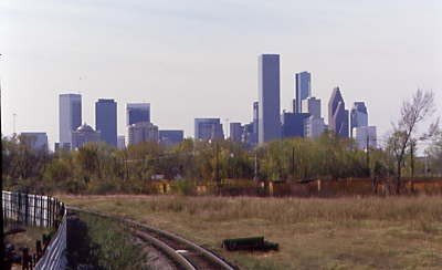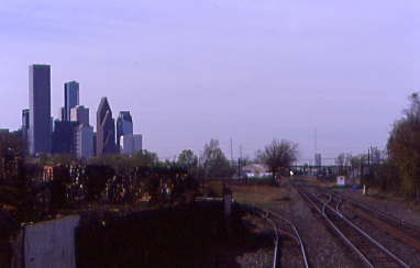 The skyline of Houston. We stopped and on the bridge overhead, I saw two Houston light rail trains clamour along.