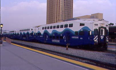 The structure for the east tower was up and coming along. Pacific Surfliner 573 arrived on time with cab car 6905, coaches 6403, 6407 and 6404, coach/café 6304 and Pacific Business Class 6852 with F59PHI 464 in push mode. We ran to Anaheim before stopping at Fullerton Junction, where Pacific Surfliner 774 passed us on its way to San Diego and BNSF 2736 West stopped before we reached Fullerton. We continued west to our Norwalk stop, part of the Rail-to-Rail Program and finished our run into Los Angeles Union Passenger Station, arriving a few minutes early. I walked over to Track 11 to watch Pacific Surfliner 578 depart and talk with Conductor Jeff. The Southwest Chief was still sitting on Track 12, having arrived at 12:55 PM then it departed to the yard and exposed the Altamont Commuter Express cars on Track 13.