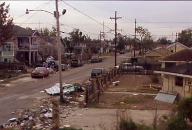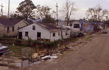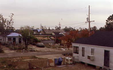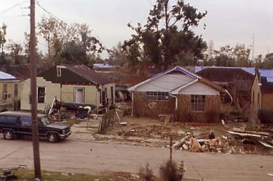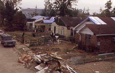 The damaged homes along our route out of the Big Easy. Blue tarped rooves indicate wind damage from Hurricane Katrina.