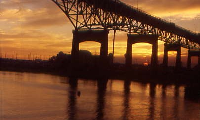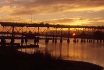 Sunset through the highway bridges at Lake Charles.