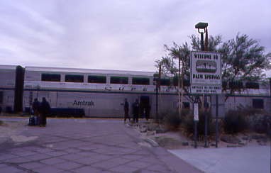 Our train moved one siding west to Ferrum, where I captured this scene of the Salton Sea with a fog rising then waited for another 18 minutes for Union Pacific 3173 East to pass. The Rolling Stones' "Rarities 1971 to 2003" was my next listening choice. The next three sidings we passed all had Union Pacific freights in them then we proceeded through Indio and at Rimlon, waited for a Union Pacific helper set to clear before we reached our Palm Springs stop, which was a prolonged fresh air stop.