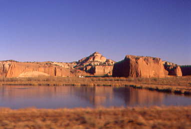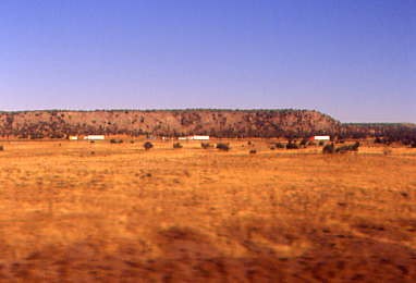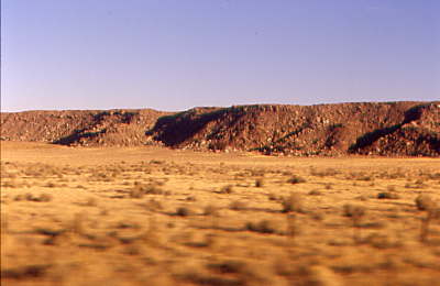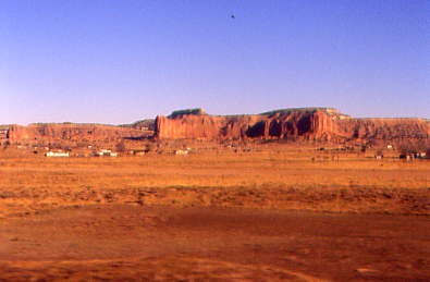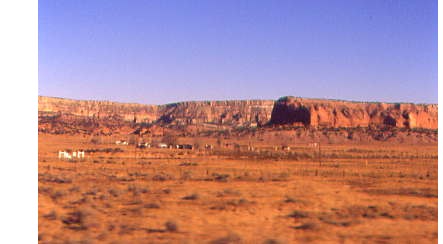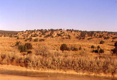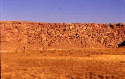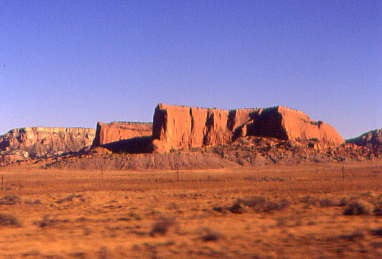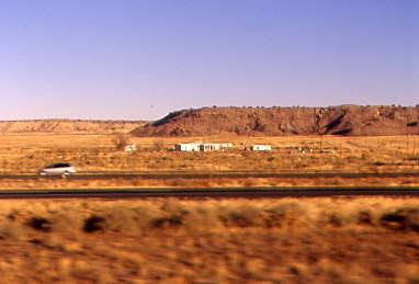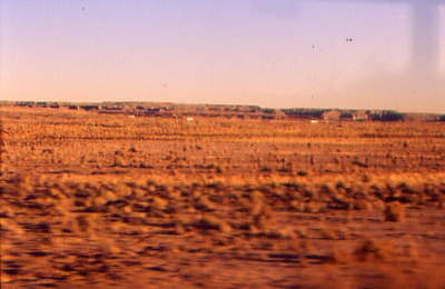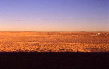 11/25/05 Running on time, I arose after the train had left Flagstaff as we rolled east under a crescent moon with a red twilight along the eastern horizon. I enjoyed a French Toast and sausage breakfast with a delightful couple from Cortez, Colorado taking this train from Riverside to Gallup. Back at my seat, I decided to photograph the scenery from the flat desert east of Holbrook to the beautiful red mesas of New Mexico.