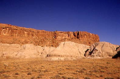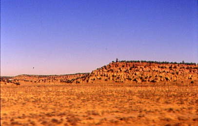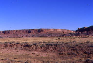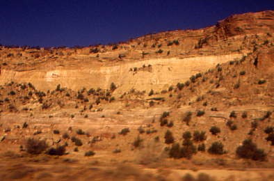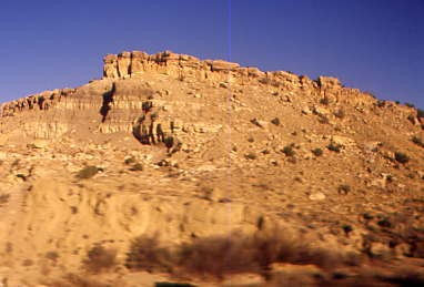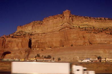 The result of erosion over a great period of time. The train stopped at Gallup before continuing east and remaining on time.
