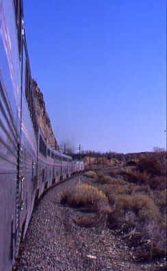 11/26/05 At about 12:40 AM MST at MP 369.9 just east of Williams Junction, I passed 900,000 rail miles while I slept soundly in my sleeping car. I officially arose for some unknown reason at 3:30 AM PST just west of Needles and must have set my watch the wrong way. The train sped west across the Mojave Desert then west of Ludlow, I went back to bed, sleeping until Victorville then went to the dining car and was seated with Bill and Andrea, travelling with their children from Garden City, Kansas to San Bernardino. I enjoyed a busy Cajon Pass while having my French Toast and sausage.
