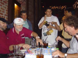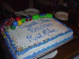 Train Travel Meetup Group Celebrates Chris Guenzler Completing 900,000 Miles of Rail Travel On Monday, November 29, 2005Our monthly Train Travel Meetup Group gathering that was usually held at the Rail Restaurant had to be moved that day due to an electrical problem. I returned Steve Grande's phone call which told me of the problem and suggested Stubrik's Steak House a few doors to the east. We had 16 people present and I had a very large surprise after dinner when they presented me with this cake that said "Congrats Chris 900,000.0 Rail Miles". I was very touched by this gesture, but still had one more trip to take this year.