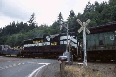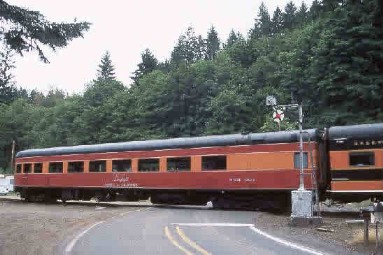 The ExcursionAt 9:02 AM. I boarded the "Red River" on what was the longest passenger train ever handled on the POTB. We had SD9s 6116, 6164 and 4406, MLIX open car 5601, Santa Fe coach "Tolani", Union Pacific coach "Echo Canyon", Pennsylvania Railroad coach "Arizona", Pennsylvania Railroad coach "St. Paul Pass", Willamette and Pacific coach 6200, Willamette and Pacific coach 6800 "Red River", MLIX baggage car 262, Willamette and Pacific lunch-counter-lounge "Running Crane Lake", Willamette and Pacific coach "Plum Creek", Pacific Northwest Chapter NRHS sleeper-lounge "Mount Hood" and Northwest Railway Museum parlour-observation car "James J. Gilmore".