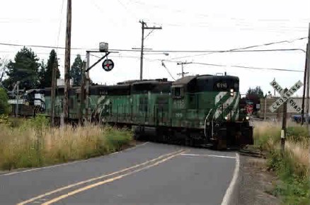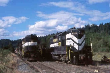 A Portland and Western freight, led by Portland and Western SD45R 3604, ex. Illinois Midland SD45 456, exx. Buffalo and Pittsburgh 456, exxx. Southern Pacific 7565, nee St. Louis-Southwestern SD45 8973, built by Electro-Motive Division in 1968, was here switching the interchange with the Port of Tillamook Bay Railroad (POTB from now on).