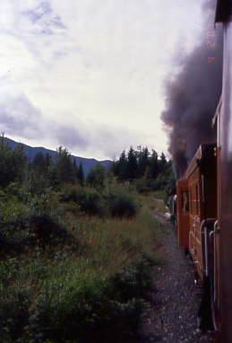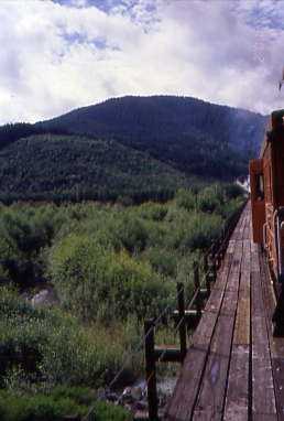 As we started up the grade to Divide, a rear view of our train. We stopped to inspect the engines and off to our left was a track that was relocated when a bridge was washed out and a new bridge was built. After about ten minutes, we continued on the journey.