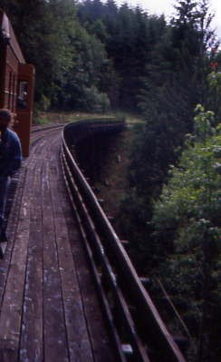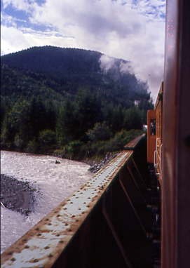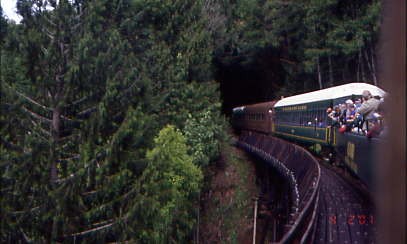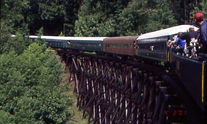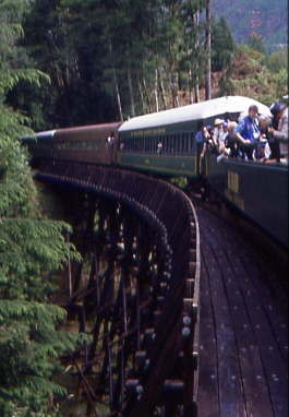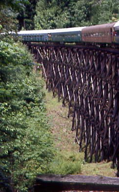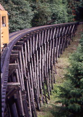 The first spectacular curved wooden trestle at Milepost 60 over 19 Creek. We then continued to twist and turn down the grade.