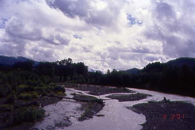 The view looking up the river. On a clear day, one can easily see Mount Rainier.