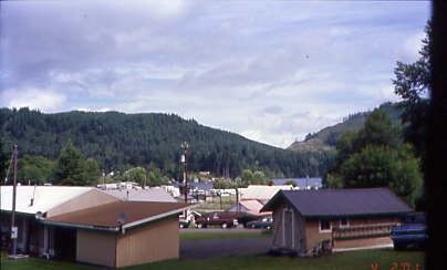The town of Mineral with Mineral Lake behind the buildings and trees.