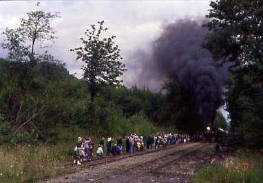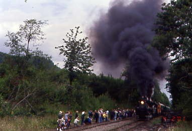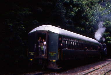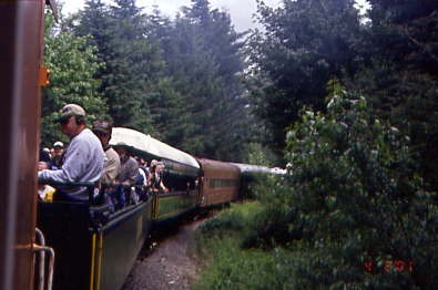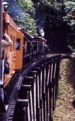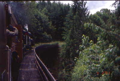 The next highlight was the crossing of the first wooden curved trestle. Another stop was made to service our two steam engines then we ran to the yard at Mineral and our timing was perfect as the regular excursion train had just finished going around the balloon track. Our crew called him on the radio to ask him to run by us so the passengers of both trains could have a photo runby and cameras were clicking away on both trains.