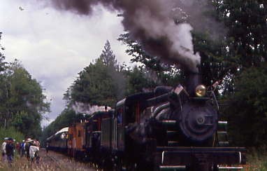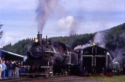 Making up the normal excursion train for this Saturday was Hammond Lumber Company 2-8-2T 17 1942, nee Crossett Western 11 built by American Locomotive Company in 1929. That year, much of the Crossett timber lands suffered a series of major fires known as the Tillamook Burn and 11 worked through the 1930's and early 1940's hauling out timber salvaged from the burn. In 1945, fire destroyed a series of trestles while the locomotive was at a logging camp known as "The Gap" and it was decided the cost of rebuilding the trestles was too great and 17 sat at the camp unused for twenty years.