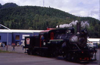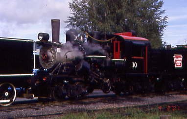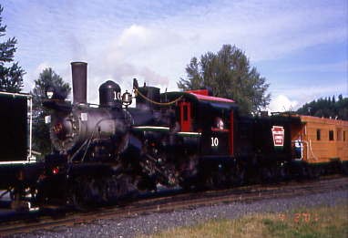 Hillcrest Lumber Climax 10, ex. Victoria Pacific 10 1980, exx. Hillcrest Lumber 10 1970, nee Hillcrest Lumber 3 built by Climax Locomotive Works in 1928. It was the penultimate Climax built and worked at Mesachie Lake on Vancouver Island. In 1968, when the Mesachie Lake mill shut down, 10 was the last Climax in regular operation in the world. That year, it was sold to a collector who planned to use it on the Victoria Pacific tourist railroad in Victoria, but the operation never started. In 1979, the locomotive was bought by the MRSR, restored and became the first steam engine to operate for the railroad.