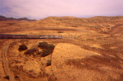 Coast Starlight 14 9/24/05The Coast Starlight reversed into Los Angeles Union Station at 9:30 AM with its consist of P42DCs 158 and 159, baggage 1241, transition 39022, sleepers 32111 "Washington", 32075 "Connecticut" and 32084 "Kansas", 33039 sightseer lounge (substituting for the Pacific Parlour Car), diner 38046, lounge 33019 and coaches 34034, 34512 and 34039. We departed on time and made our way out into the very cloudy San Fernando Valley as I rode in coach 34512, along with Kevin Densdale from Cheltenham, Gloucesterhire in England. My car attendant was the wonderful Erika.