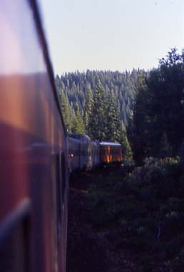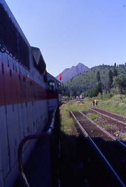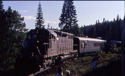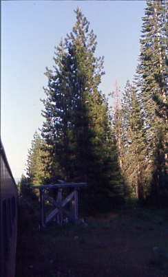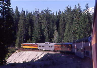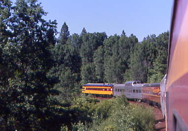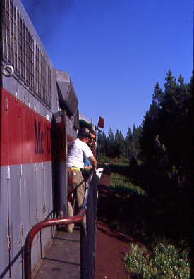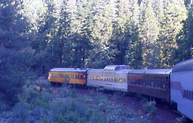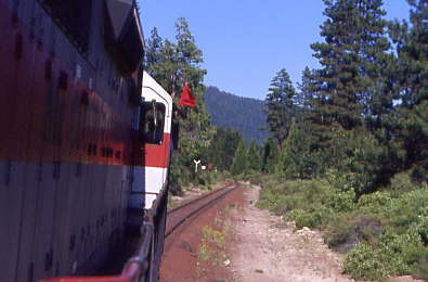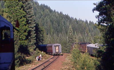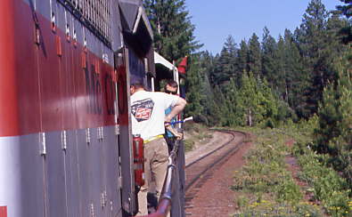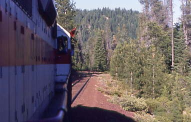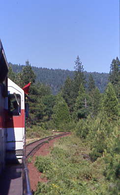 Once we reached the Summit at Pierce, the engineer switched on the dynamic braking system and the locomotive then ran fine and Steve's duties were done. We ran to the Signal Butte switchback, where we found all of the First Section passengers off their train taking pictures of our train. The plan was to offload our passengers here so we could also photograph the McCloud dinner train arriving, but because of our problems coming over the hill from Mount Shasta City, we were over an hour late getting here. We asked our car attendant about detrianing, but he knew nothing and sounded like Sergeant Schultz on "Hogan's Heros". We asked him to find out if we could get off or not but never saw him again the rest of the trip until he detrained in McCloud. The train pulled all the way down the switchback to near the First Section.